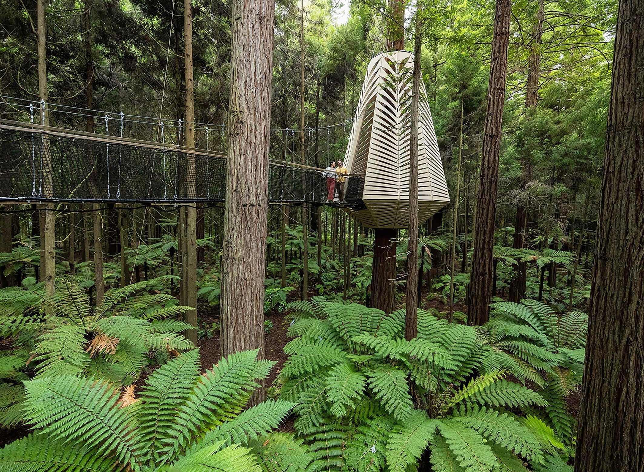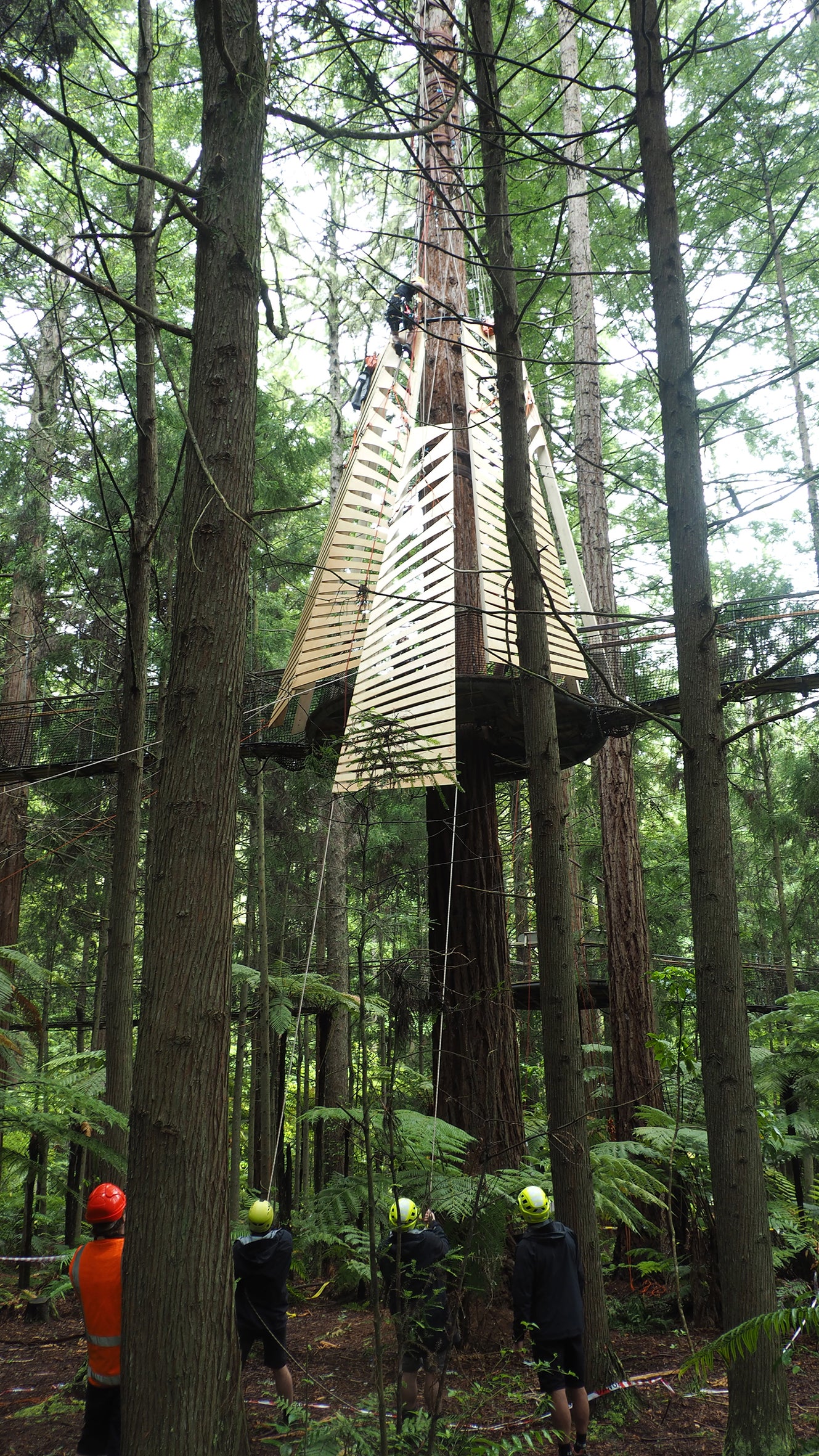 Horoeka fully surrounds one of the platforms on the walkway and is 9m high to match the enormous scale of the redwood forest. Also it creates an internal, introspective experience which contrasts strongly to the expansive nature of the rest of the tree walk.