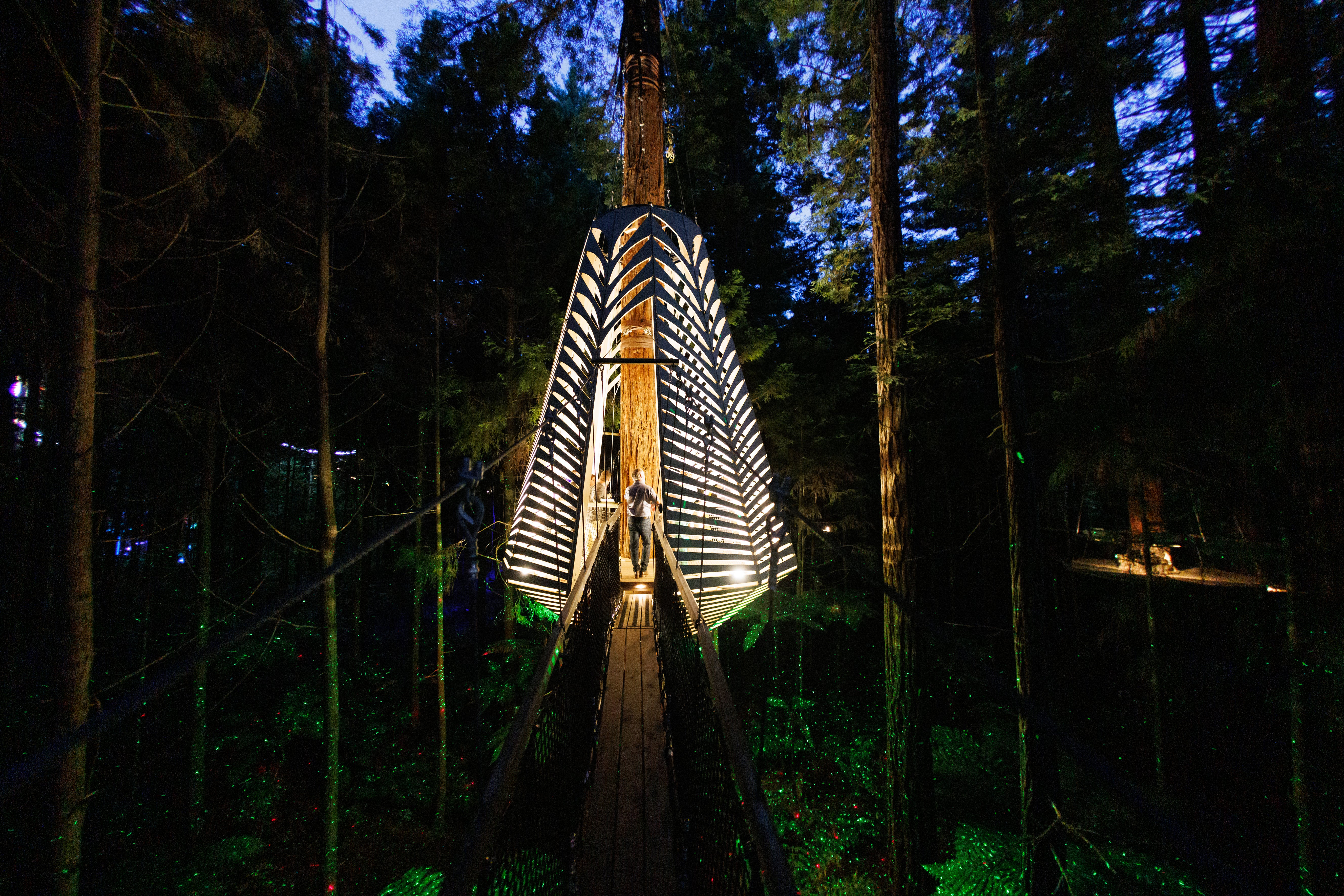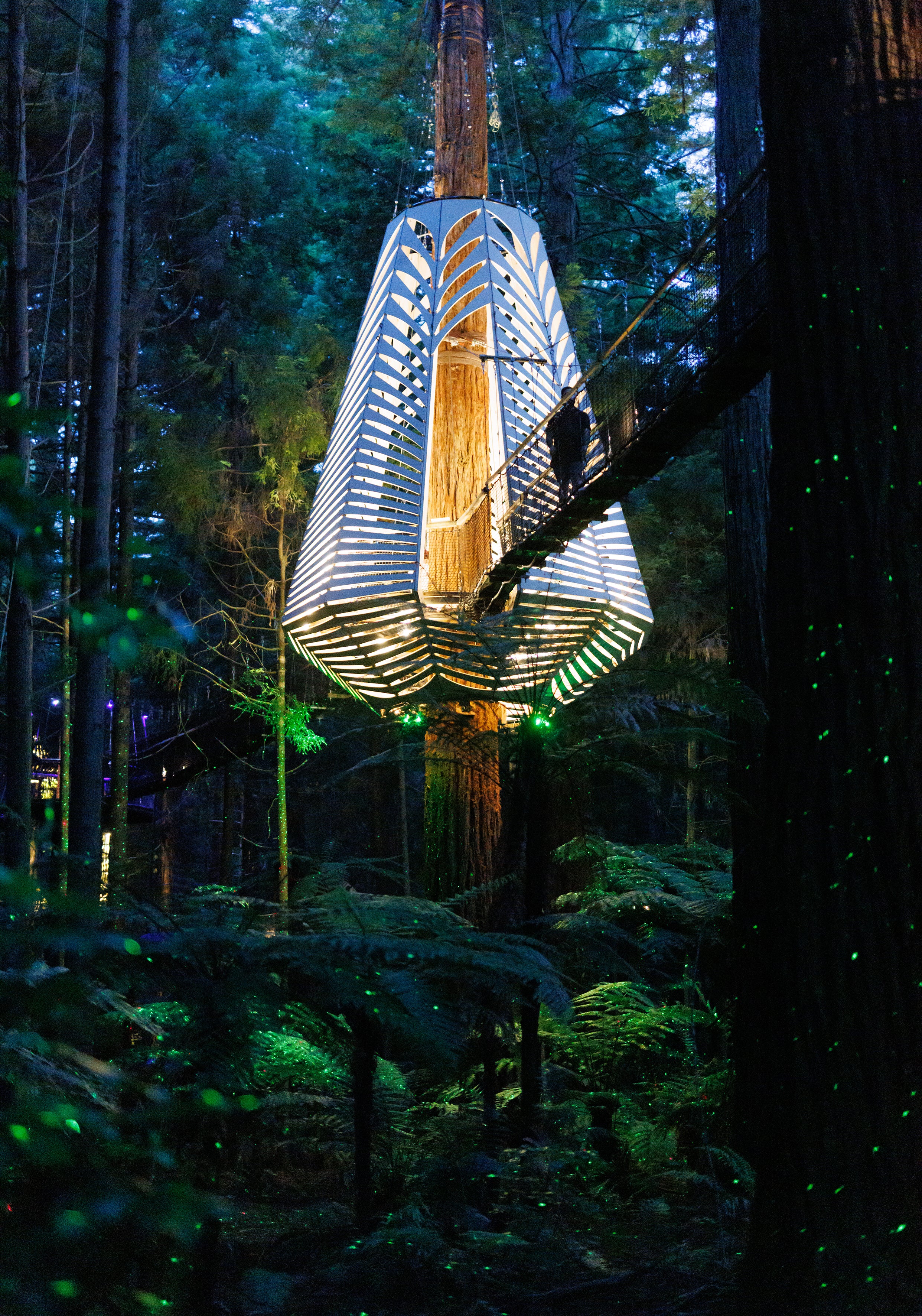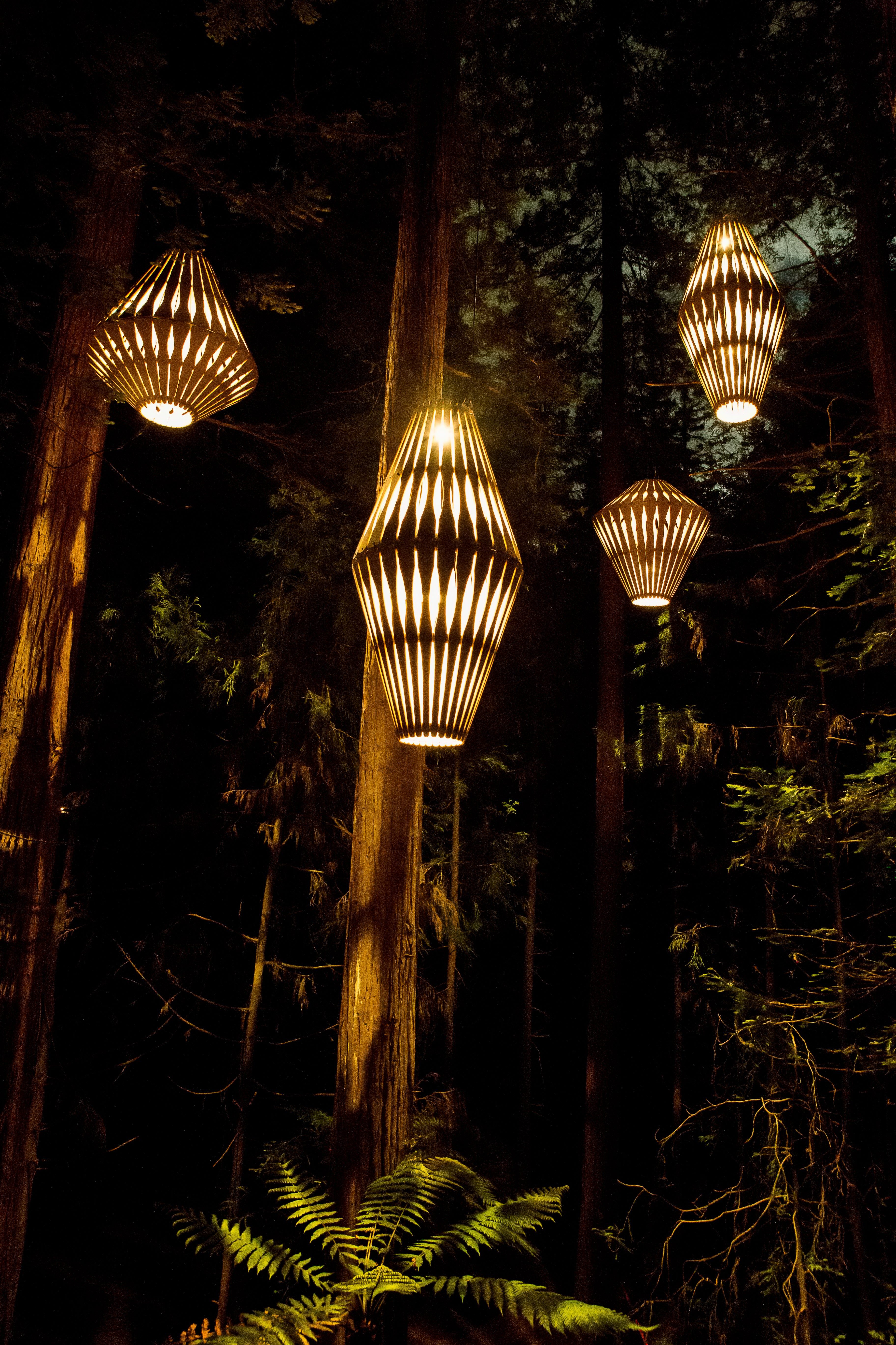 Horoeka is an extension of the existing lights we installed for the Rotorua Redwoods Tree Walk in 2016. It uses the same vocabulary as the lights to make an even larger, walk-through, lit form or 'pod'.