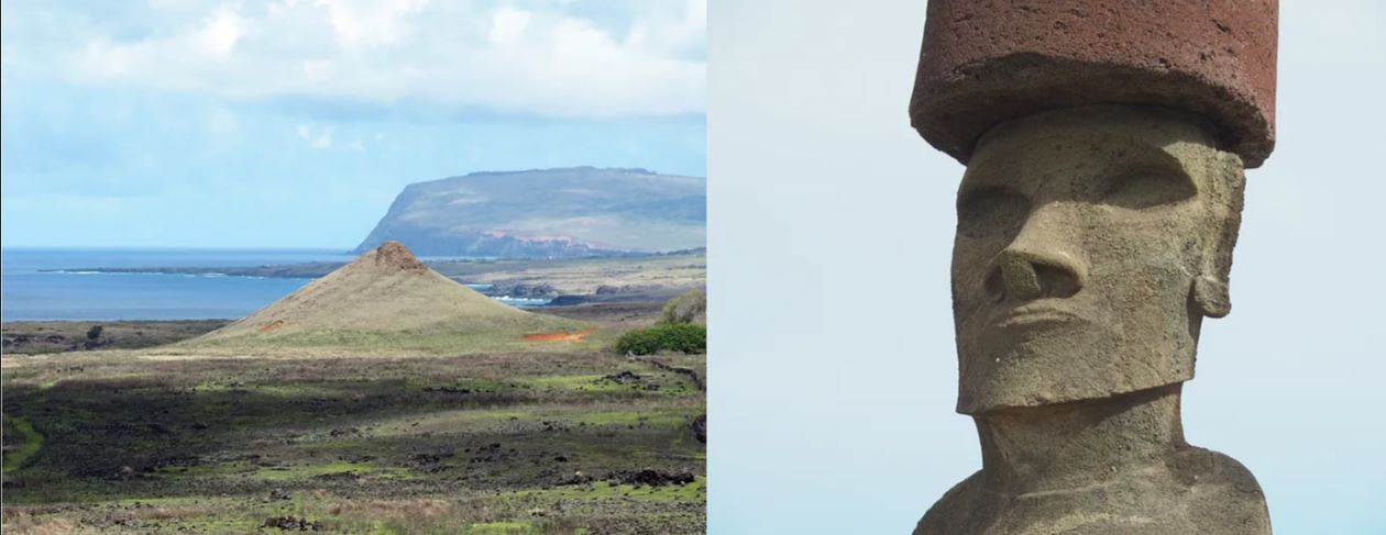 So the art was an incremental product of society and land. The stylisation had its own life and justification, its own internal imperative. The only thing that changed over time was their technical mastery over stone: the moai became larger and larger in ever grander statements of self-importance. The giant figures were transported unbelievable distances across the island from one quarry, while the red topknots came from another quarry at the other end of the island. The carving was done by teams, working together in time to a rhythmic chant, chipping at the soft volcanic tuff with harder rocks.
