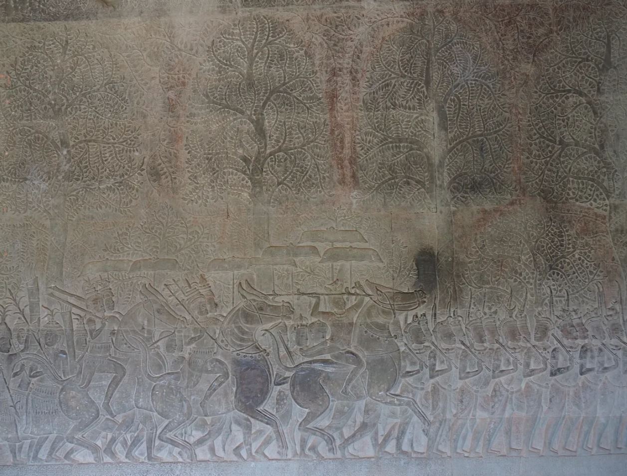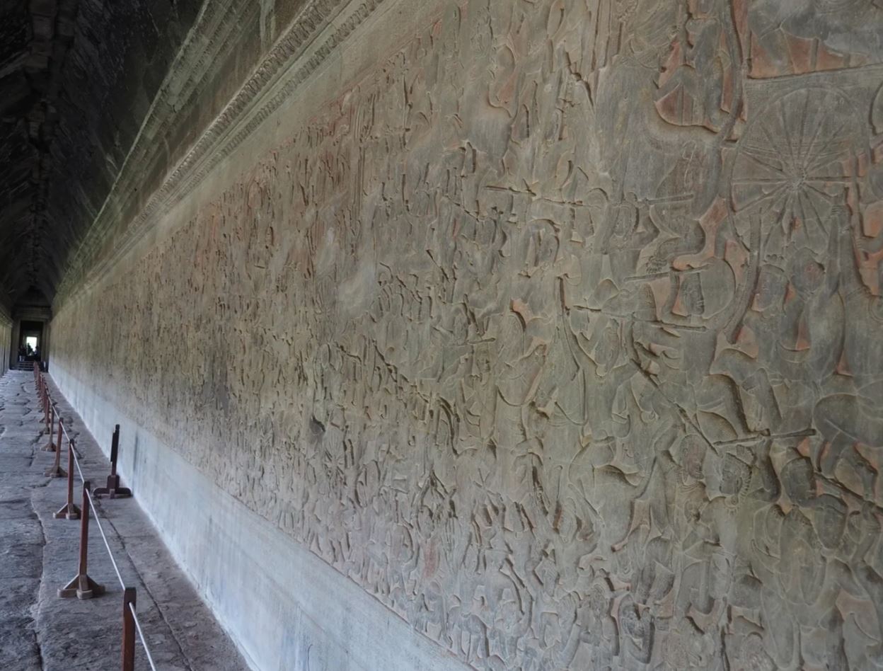 I moved on to the central focus of buildings. In an open courtyard, where the sun beat down brutally on the hot stones, a massive queue of almost entirely Chinese had formed to climb up the steep steps to the top in order to get a ‘commanding’ view. Around this there is an inner gallery. Here, as I admired nearly 400 metres of intricate relief carving, it began to dawn on me: this is more than just a temple, it is also a massive statement of power and aggrandisement.