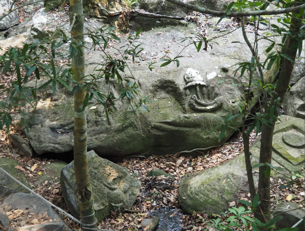 On another day I took a long jolting ride in a tuk-tuk out to Kbal Spean in the forested hills north of Siem Reap. As I climbed up the path through the forest, the heat beat down like a hammer and my sweat poured, but away from the pressure of crowds this bothered me less. A bird call, like liquid bubbles of sound, echoed through the trees, interspersed with another that rasped like a metal grinder. At the top I found a small group of carvings in stream-bed rocks, probably made by a hermit about 1000 years ago. The carved reclining deities are small and nestled into the rocks of the stream course. It was the dry season and the flow was almost gone, so that the accompanying ordered rows of lingas were fully exposed.