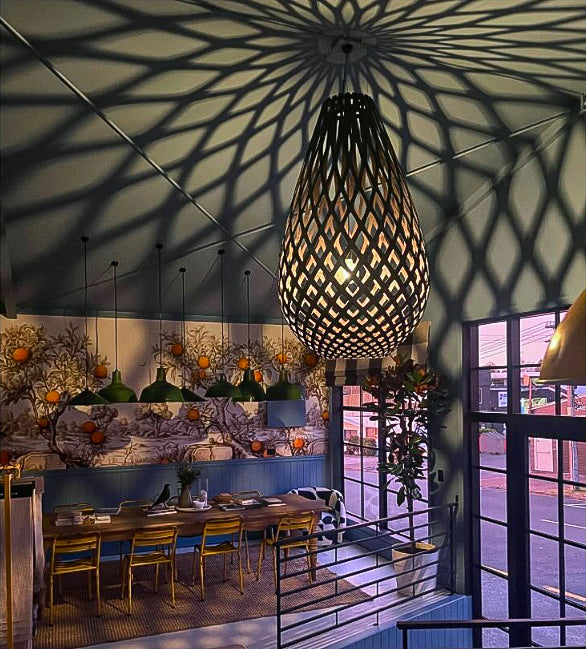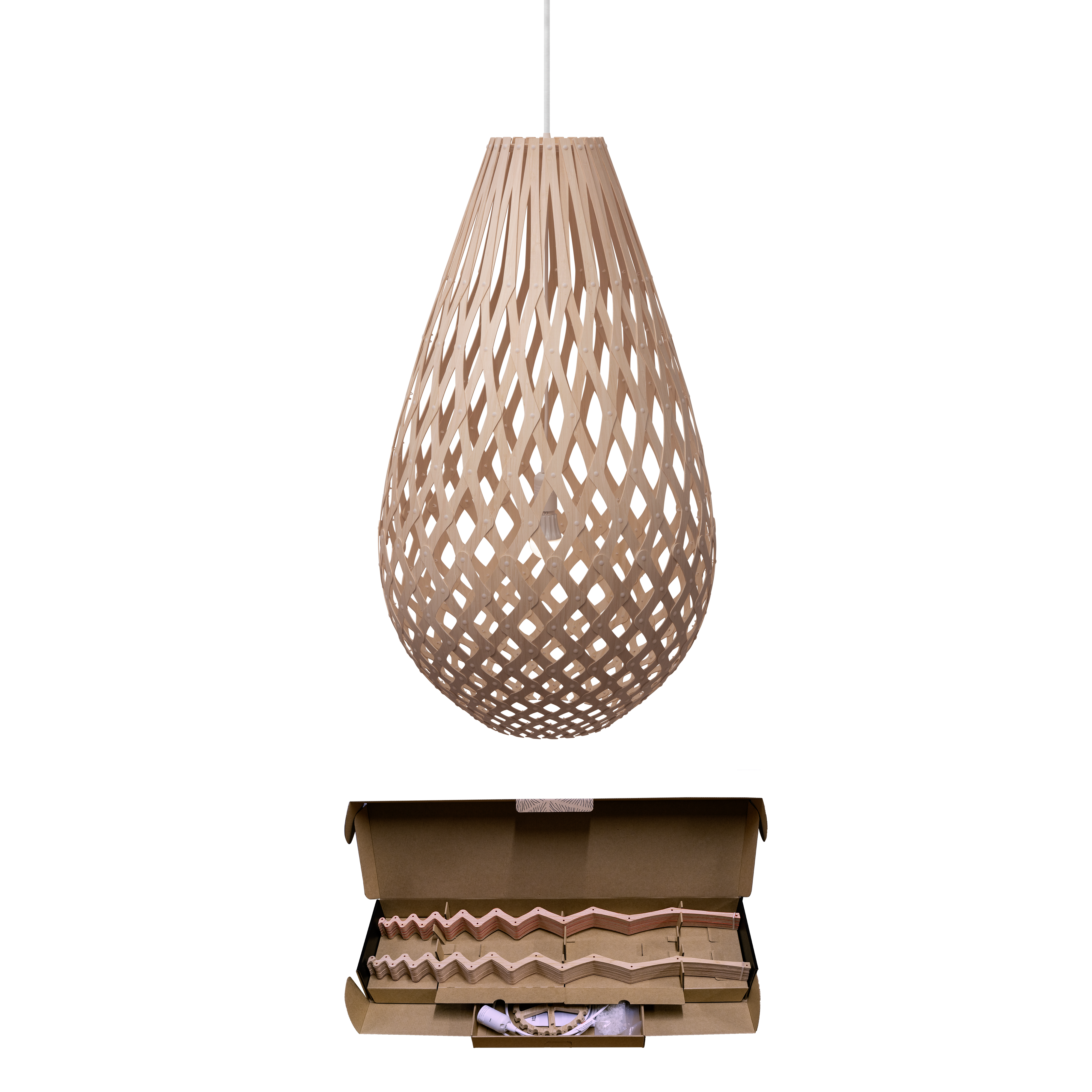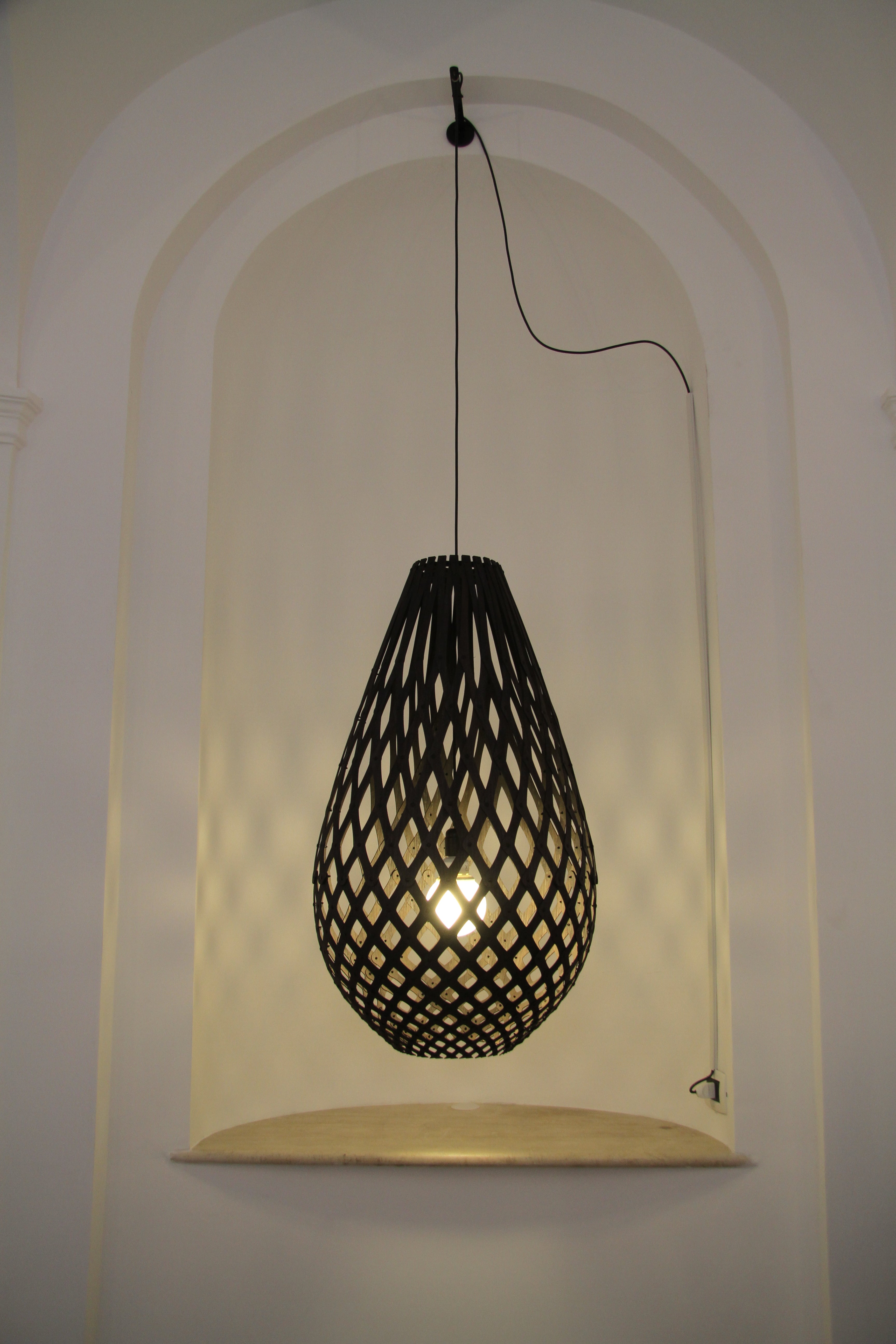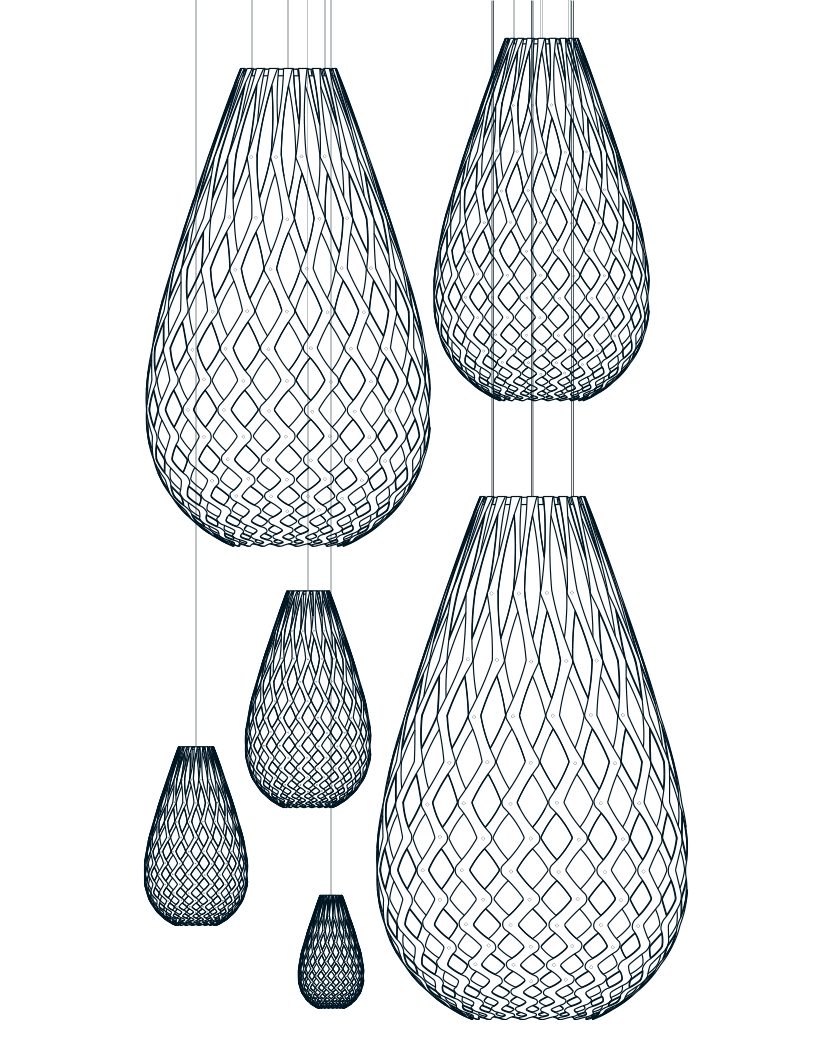 The droplet-like form of Kōura mimics the curled form of our native freshwater shrimp kōura, named by the indigenous Māori people. David was also inspired by the intricately made traps used by early Māori to catch kōura. Kōura is predominantly used as a feature sculptural lighting piece, to attract attention to a certain location. Often it hangs over a bar, in an entry space, in stairwell or even a hall. It has a strong presence of calm purity and beauty that the choice of finish can amplify.