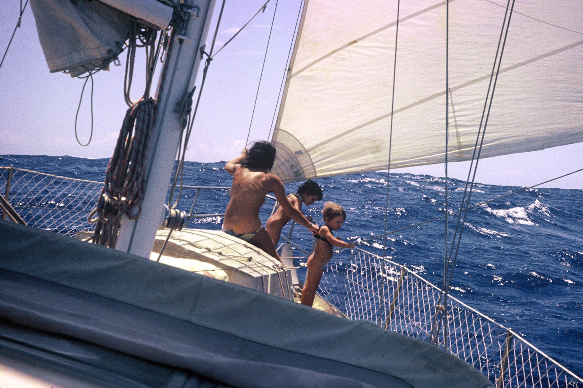 Linda with Sam and Billy on Hornpipe in mid-Atlantic.