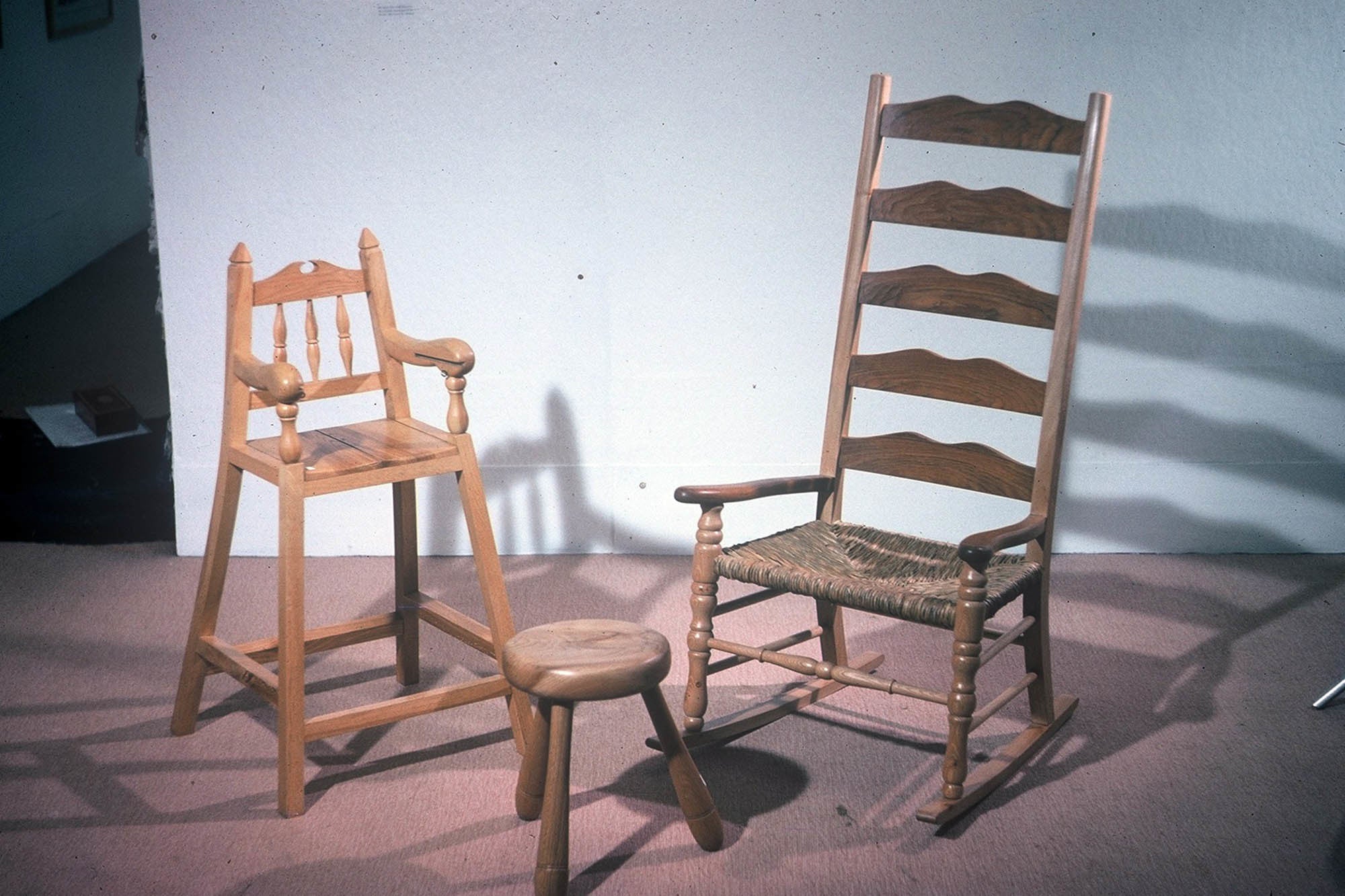 A telling collection of pieces made by David, representing the needs of a young family after Sam and William were born. Making traditional designs like this taught David the craft of woodworking.