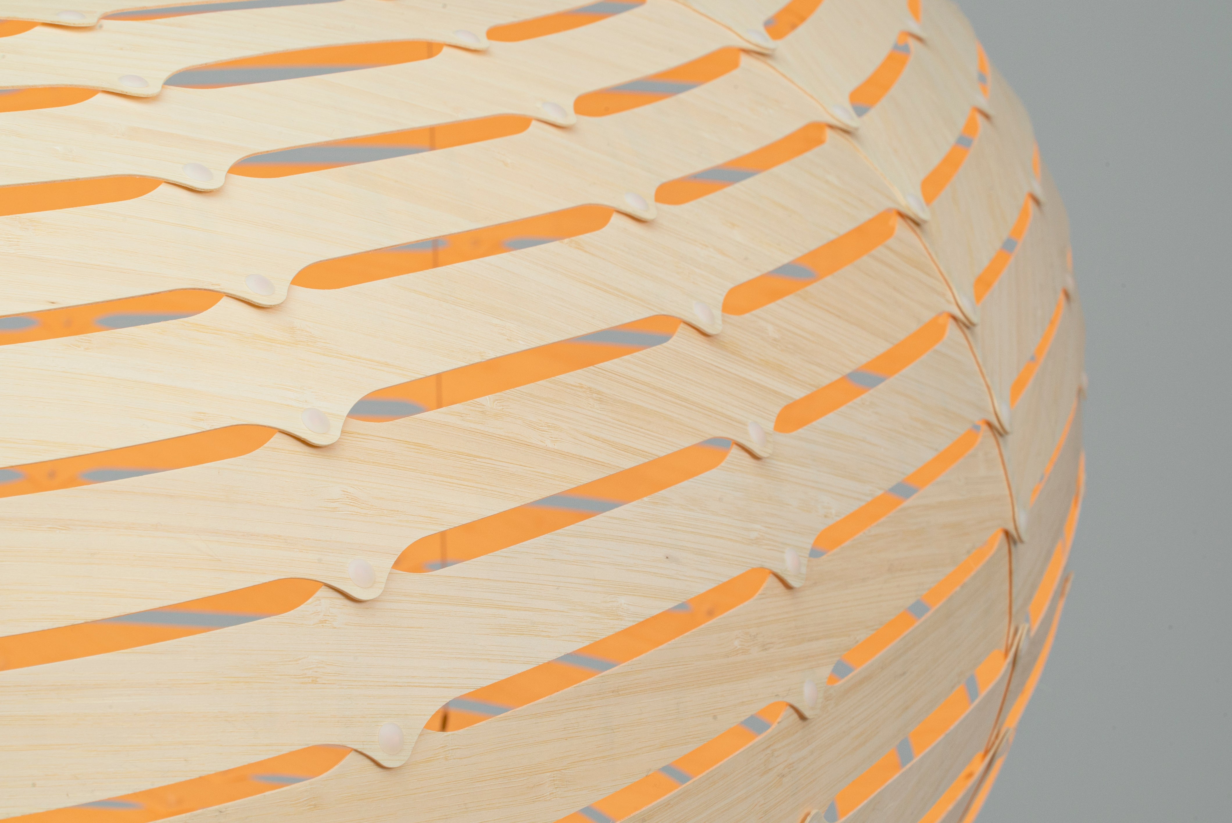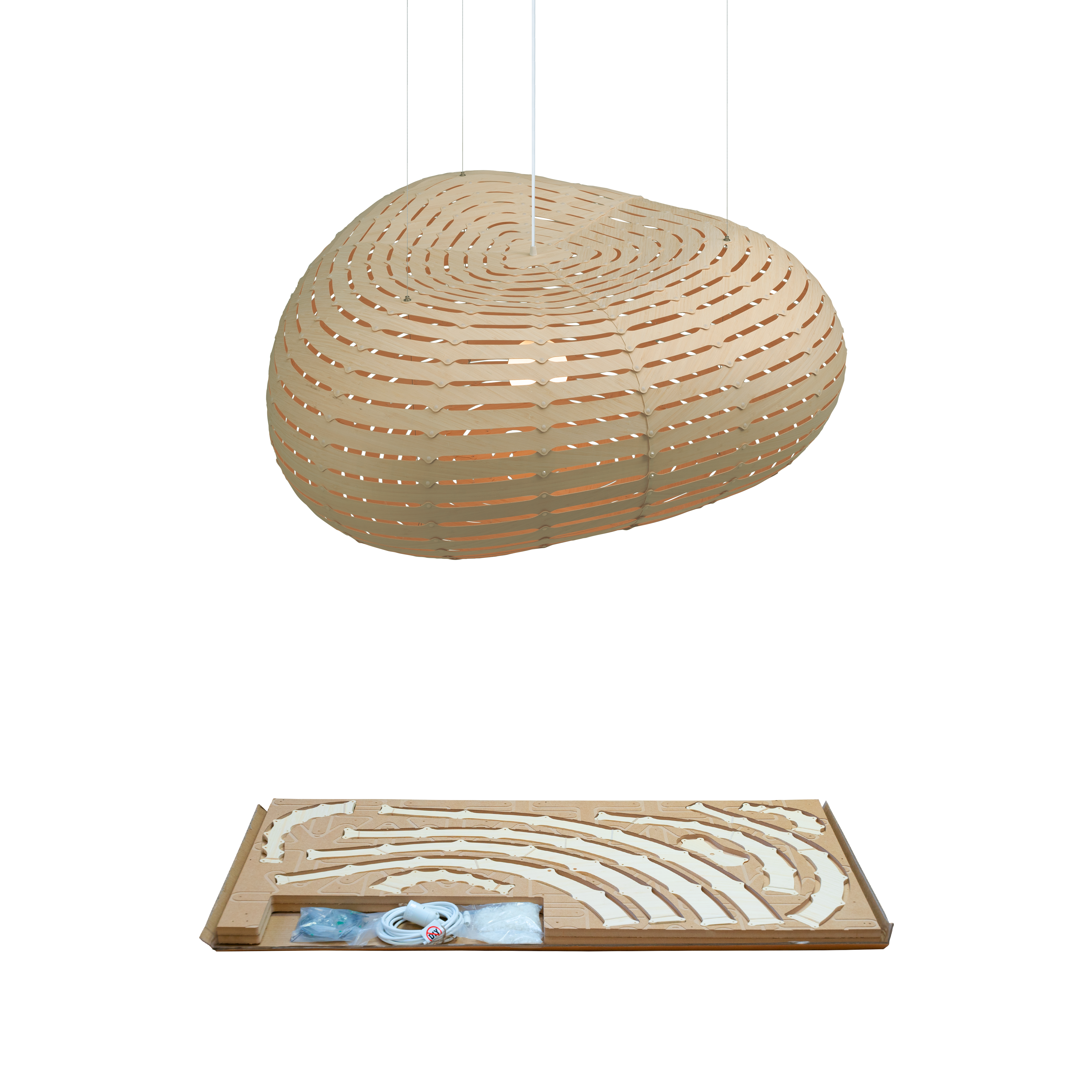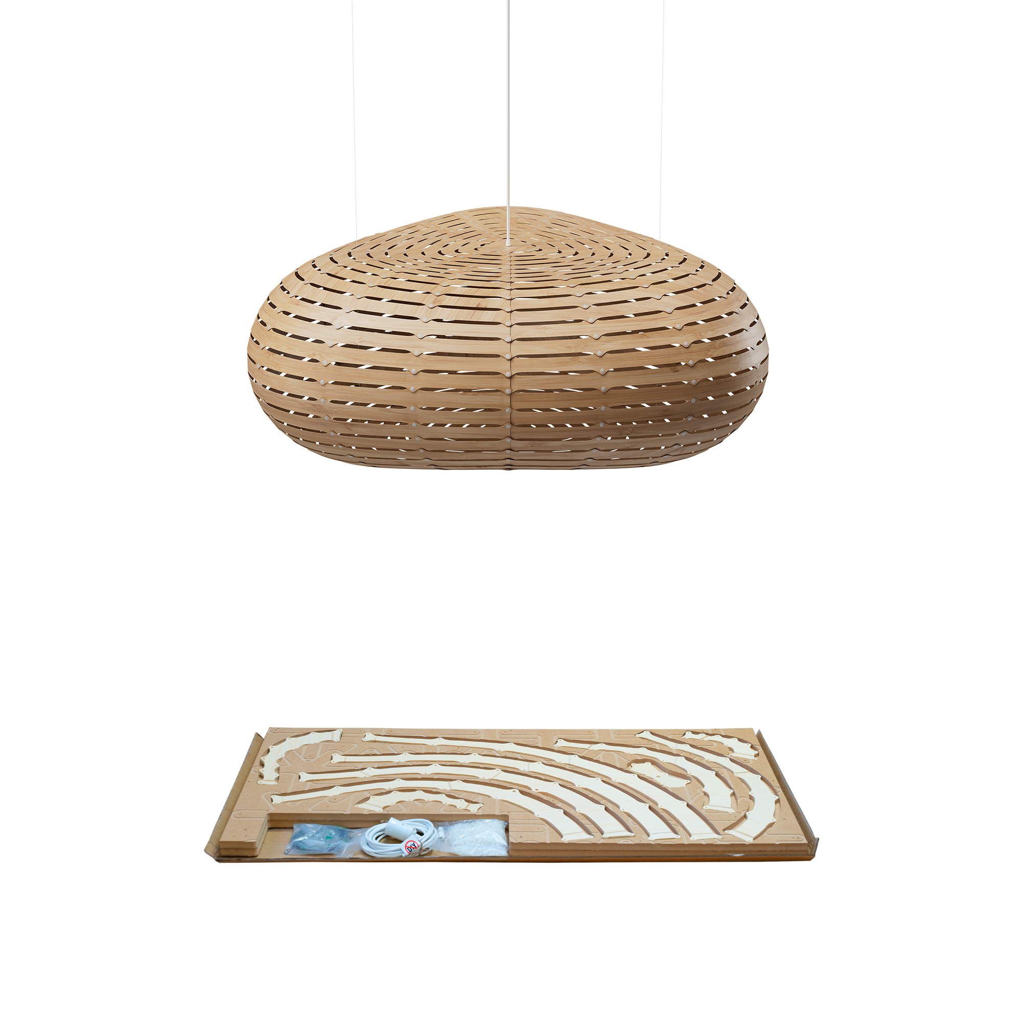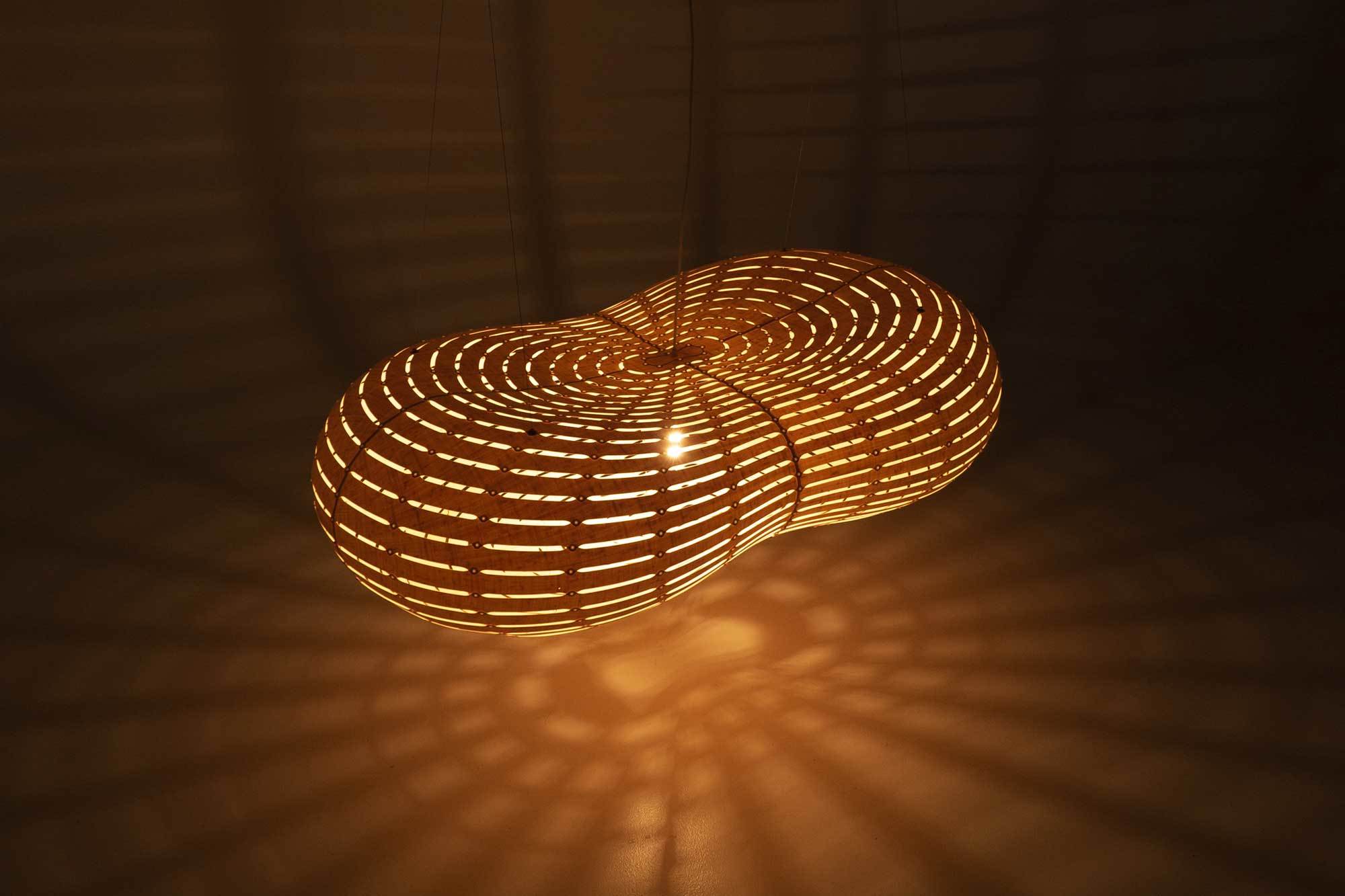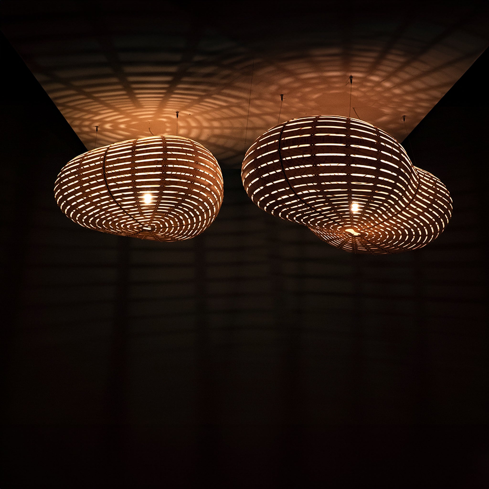 Cloud lights were first launched in 2008 as part of the Spiral Islands installation of matching lights and settees. This was inspired by the clouds that David saw sitting over small islands all over the Pacific Ocean, which were used by Polynesian navigators to find islands from afar. The Cloud lights were made with frosted plastic but were later discontinued due to the negative environmental impact of the material. Cloud has now been given a second chance through a new material. The new version is made almost entirely of bamboo plywood applied in the same strips or rings. This allows light to shine through while offering a similar visual lightness as the former translucent plastic version.