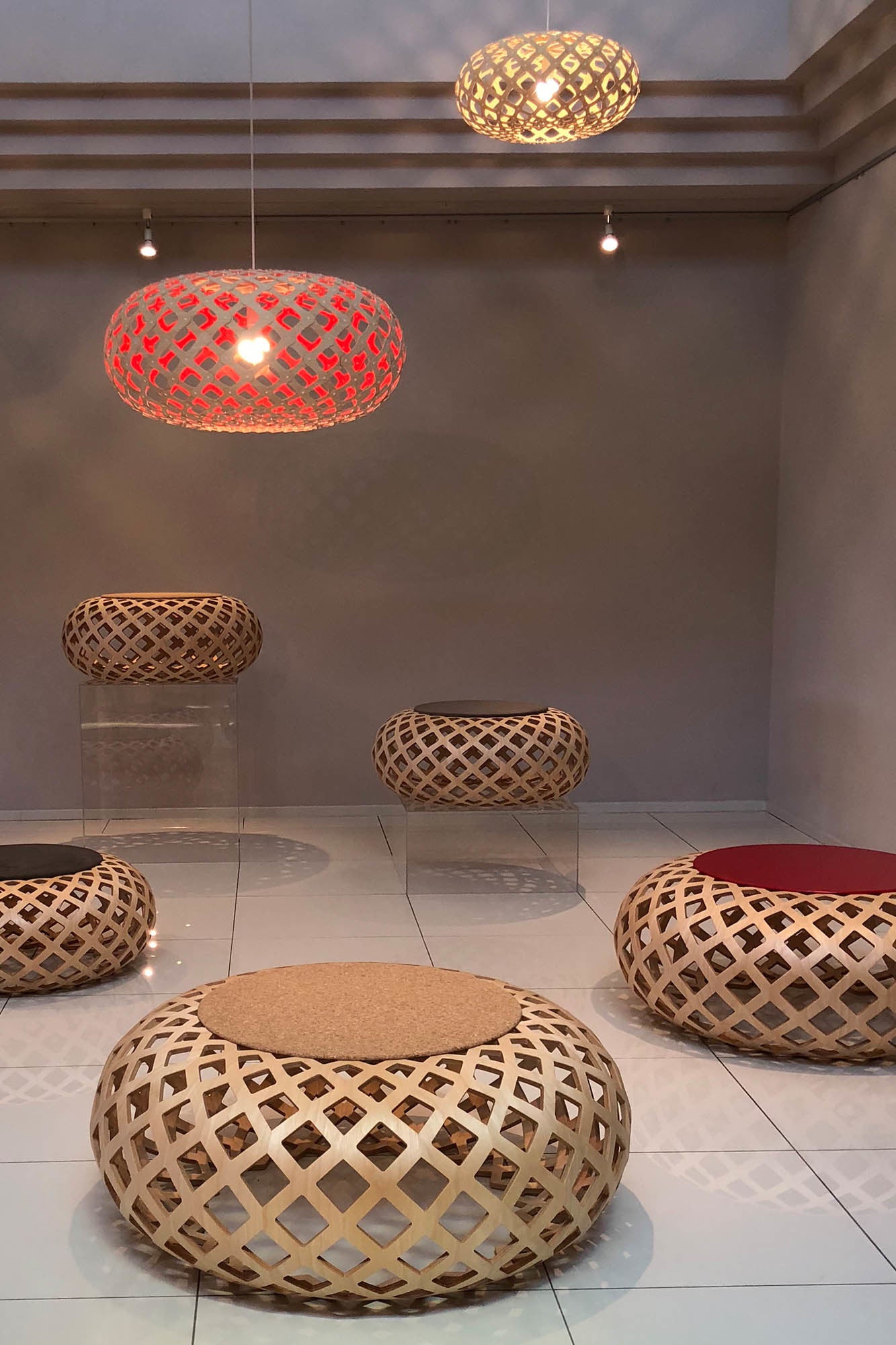 When David first designed Kina in 2005 it was as an ottoman. But the thin flexible plywood needed to take up the curves was not strong enough to bear any loading. So instead Kina became a light and it was entered it for the IFDA competition in Asahikawa, Japan where it won a Silver Leaf Award. In 2016 IFDA approached us once again, as a past winner, with an invitation to be part of a commemorative exhibition for 2017 to celebrate 10 years of IFDA shows. They asked us to team up with one of their wood manufacturers in Hokkaido with a new design.