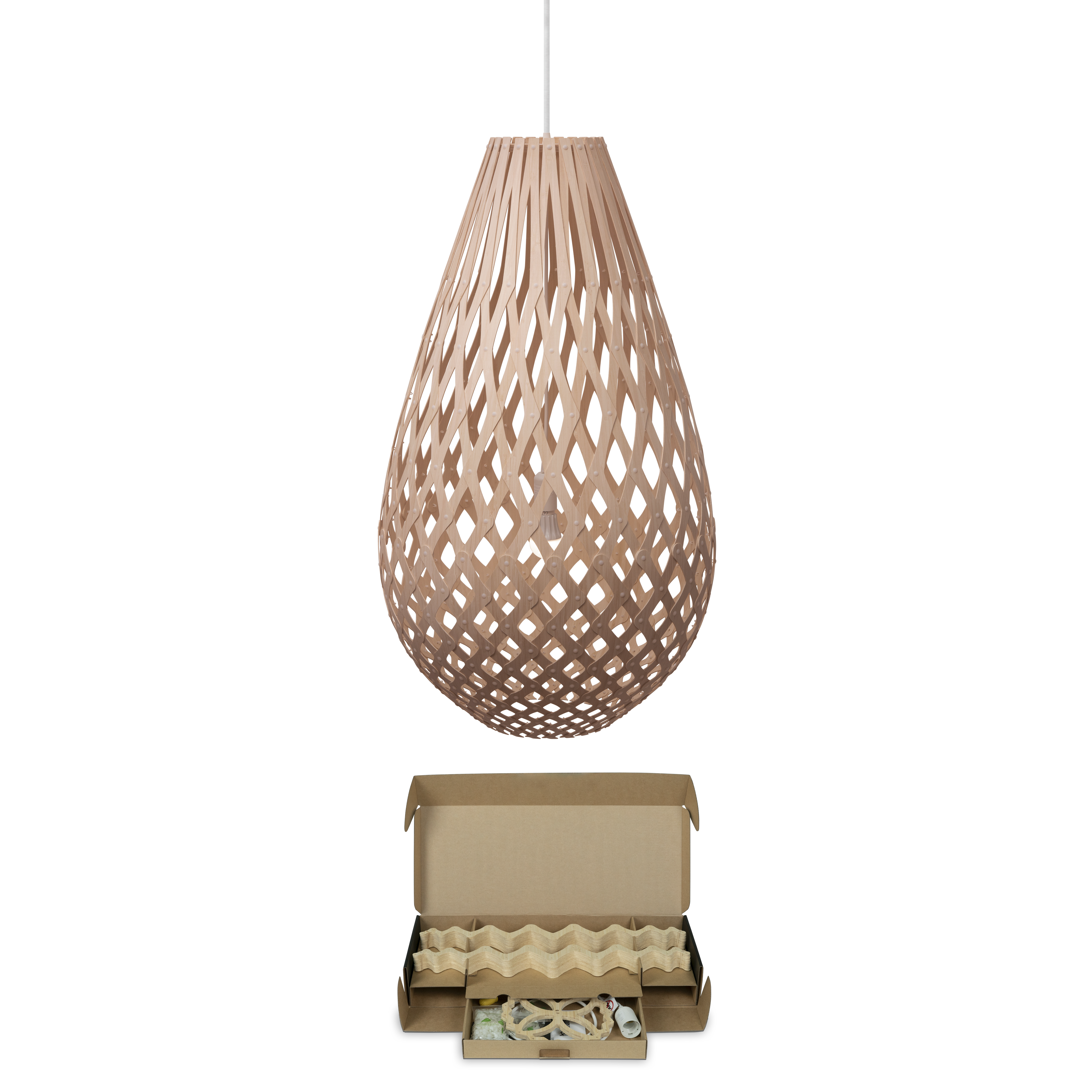 The droplet-like form of Kōura mimics the curled form of our native freshwater shrimp kōura, named by the indigenous Māori people. David was also inspired by the intricately made traps used by early Māori to catch kōura. Kōura is predominantly used as a feature sculptural lighting piece, to attract attention to a certain location. Often it hangs over a bar, in an entry space, in stairwell or even a hall. It has a strong presence of calm purity and beauty that the choice of finish can amplify.