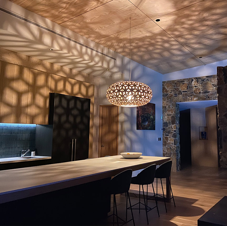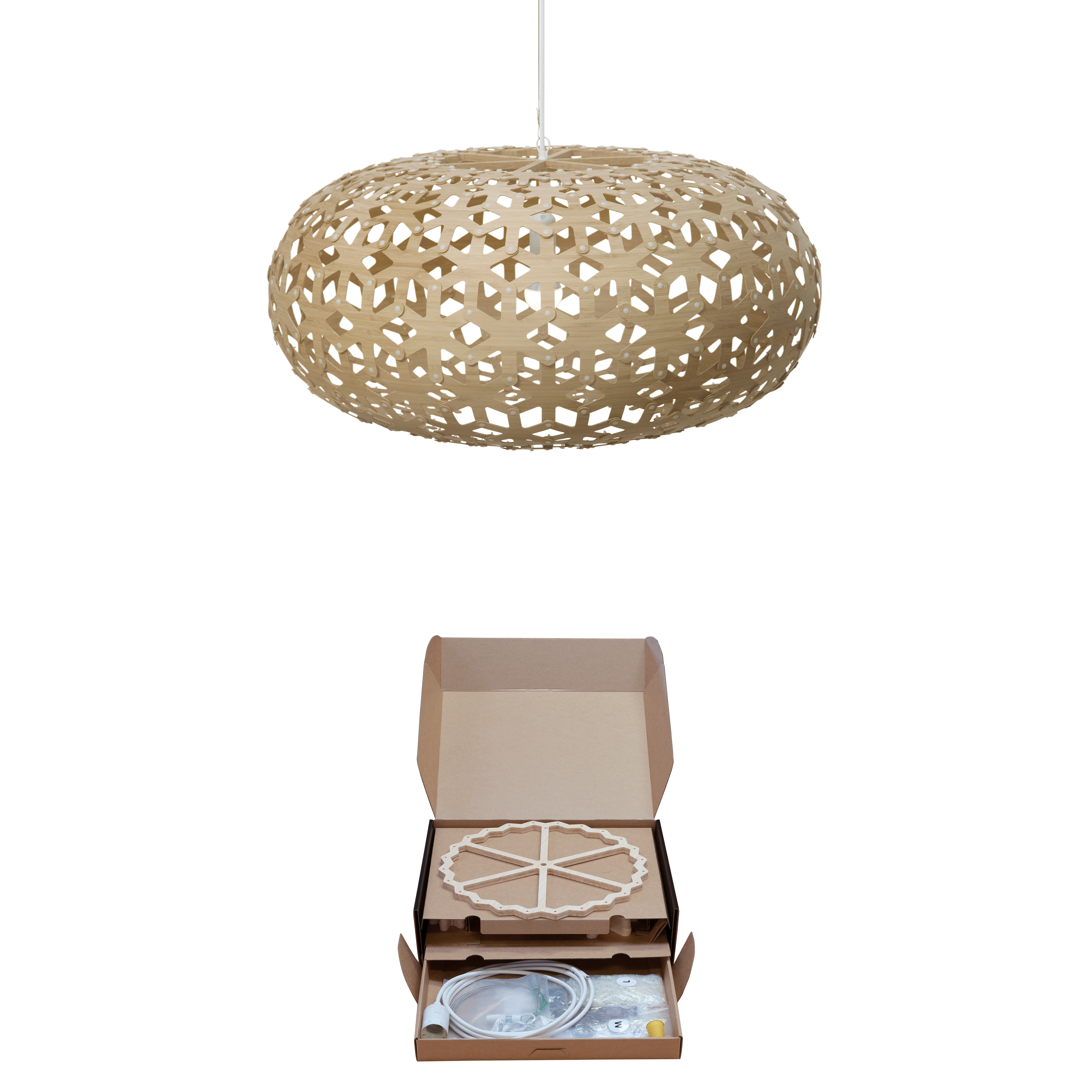 The idea for Snowflake was influenced by David's artist residency in Antarctica in 2004. Snowflake is a similar form to Kina, but has a totally different geometry. In 2015 it won a Red Dot Design Award for lighting design and has been a popular light since. Snowflake is assembled from snowflake shaped bamboo components clipped into a tensile, thin skin.