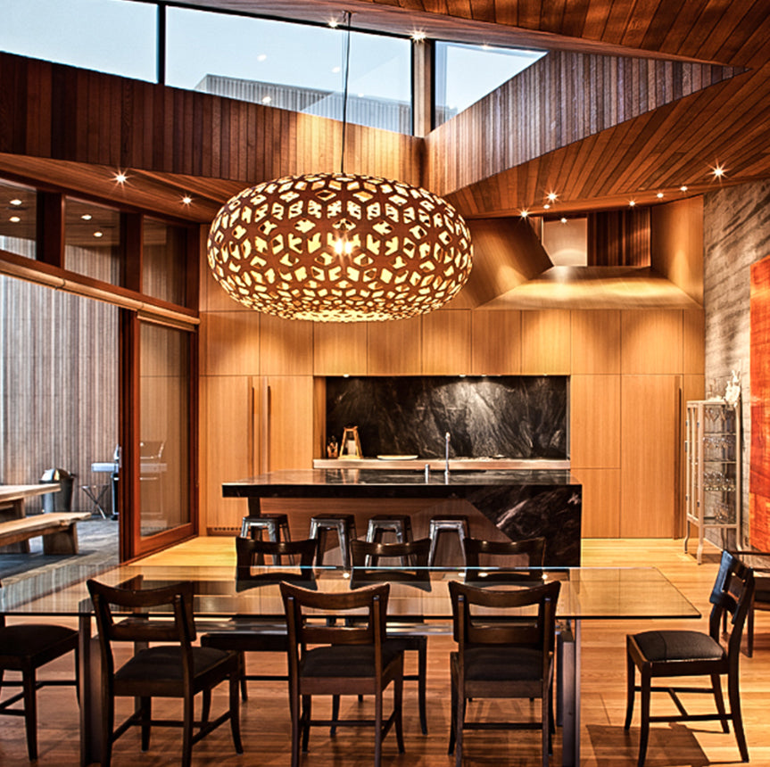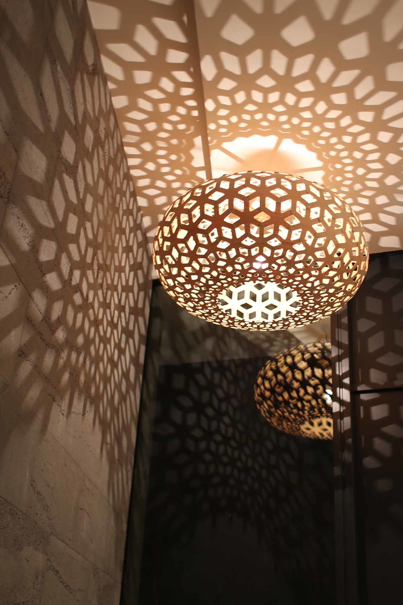 The geometry of construction creates intricate diamond apertures, allowing light to spill out in dappled shadows. Snowflake is equally effective over a dining table, a lounge, a reception or bar. It creates impact through its scale and cast light and is enhanced further by the range of finishes.